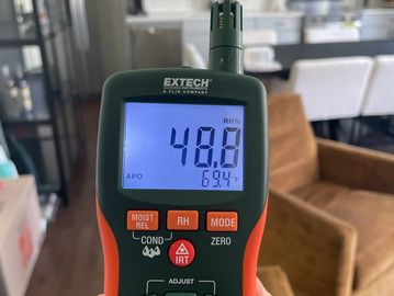 Moisture mapping with pin/pinless meters and hygrometers. We measure RH, temperature, and dew point to locate active leaks, wicking, or condensation, trace issues to the source, and document readings/photos with a dry-out or repair plan.